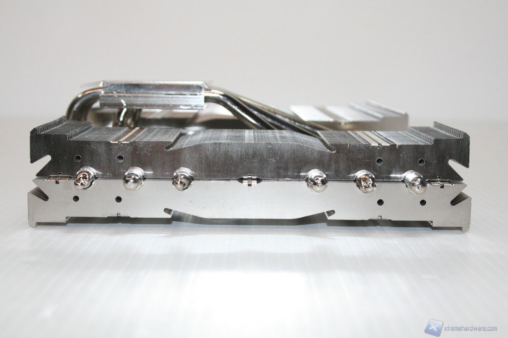 La lavorazione delle alette è esemplare, con spessore di 0.3mm e punzonate, quindi sarà stabile ma deformabile se necessario, qualora servisse di adattarlo a componenti sul PCB non standard (DREMEL required !). Le heatpipes, ben 6 da 6 mm, sono nickelate e presentano una scudatura terminale alternata. Il design è asimmetrico, con la parte sinistra di dimensioni inferiori per questioni di compatibilità. La parte centrale non prevede l’utilizzo di alette ma possiamo ammirare le 6 heatpipes che attraversano la base del dissipatore, con una conformazione ad “U” per massimizzare lo scambio termico.