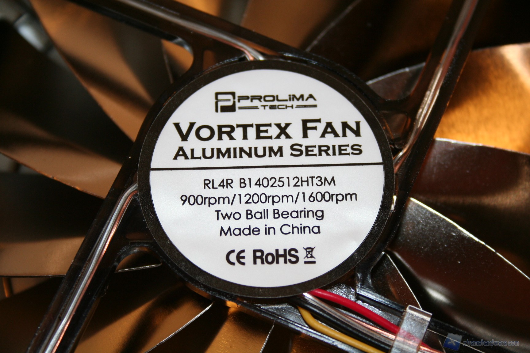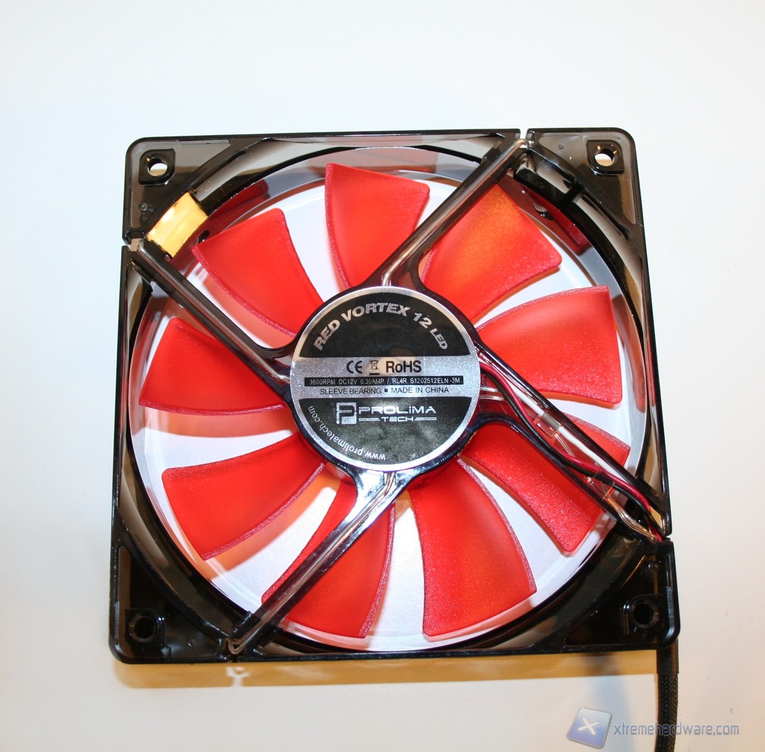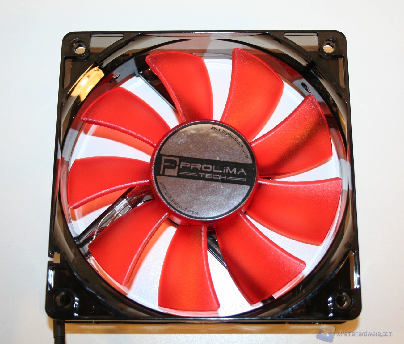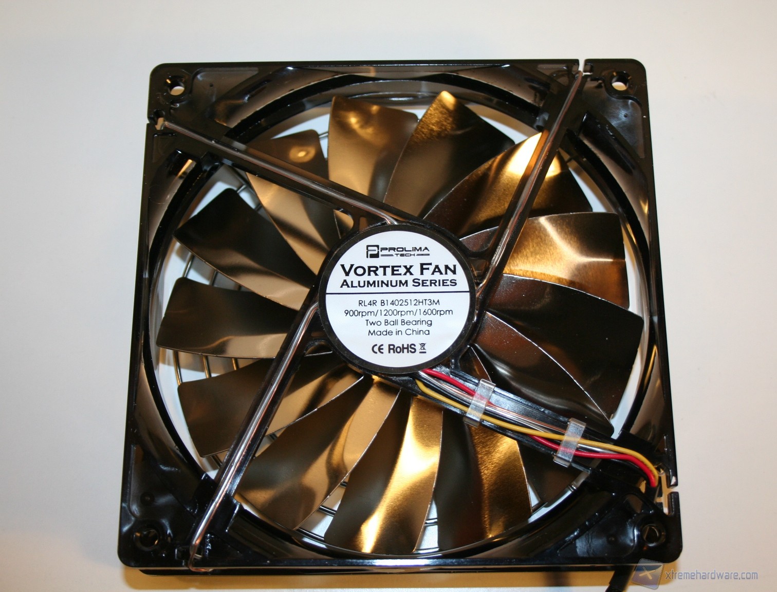 Come già fatto presente Prolimatech non fornisce nessuna ventola in dotazione; abbiamo utilizzato un modello molto particolare, la Prolimatech Aluminum da 140mm, oltre a due Prolimatech Bluevortex da 120mm LED rossi e blu! Riportiamo i dati effettivi di rotazione, ricordiamo inoltre che sono sensibili ad una variazione del 10%.