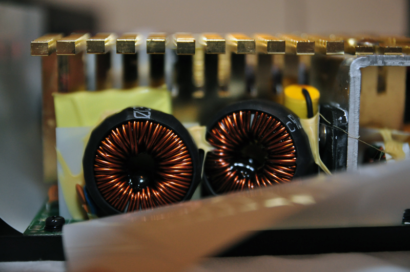 In questa immagine è possibile vedere due bobine (induttanze) in cui transita una corrente raddrizzata ma pulsante. Queste bobine sono avvolte su un nucleo toroidale e coperte in cima da una guaina nera termoresistente. Quelle in foto  sono bobine di modeste dimensioni, adatte per alimentatori di erogazione abbastanza alta, circa 700/800W.