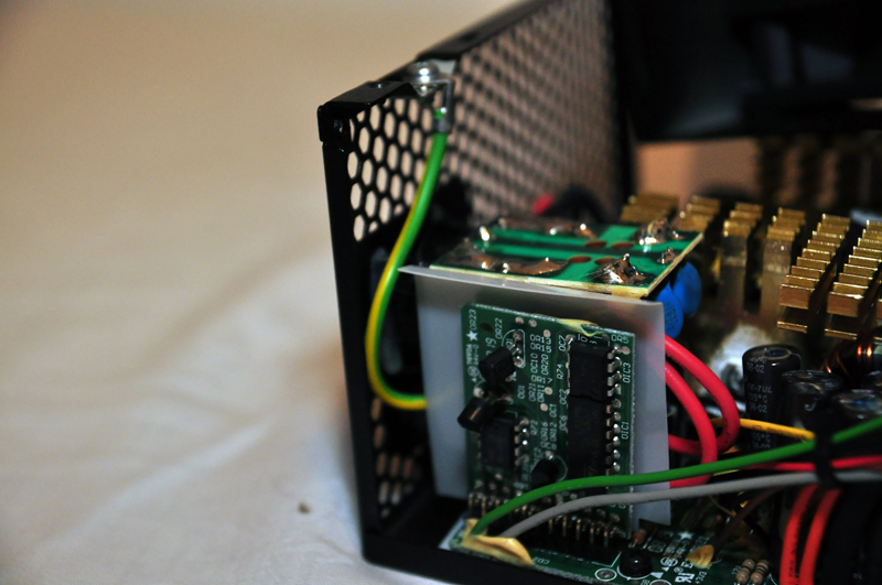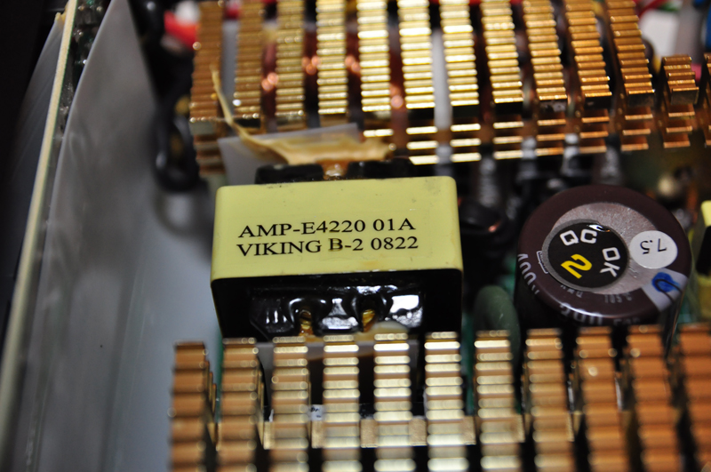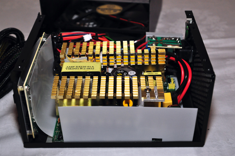 Il trasformatore principale è collocato in posizione centrale fra le due heatsink e da esso si può intravedere un fascio dei conduttori nella parte alta, isolati da una guaina nera. Nella parte sinistra possiamo notare un foglio di plastica trasparente che fornisce un ulteriore isolamento da interferenze tra il circuito stampato e lo chassis dell’alimentatore. A destra troviamo un grosso condensatore di tipo elettrolitico.