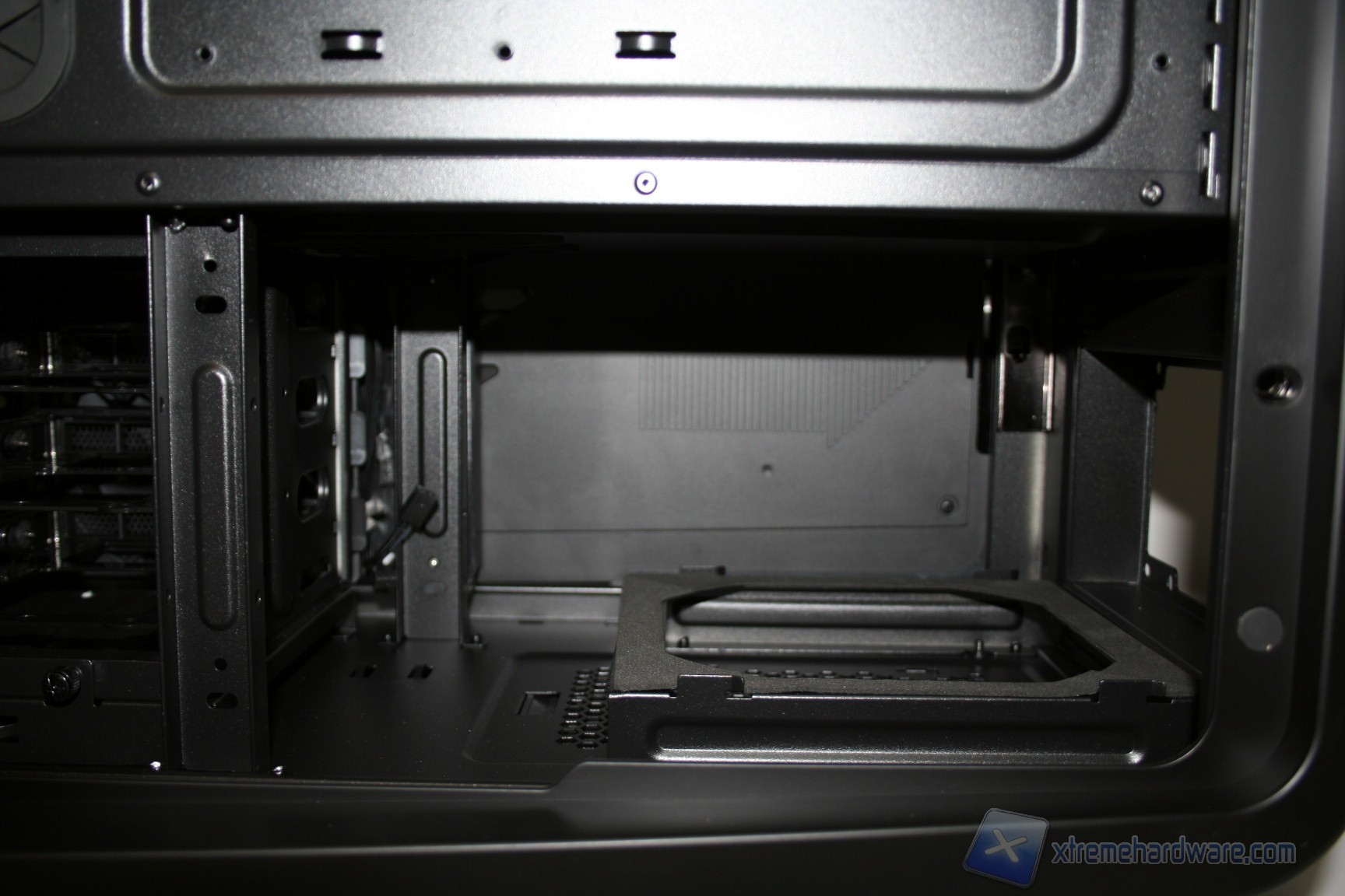 Il layout, sebbene presenti alcune ricercatezze, è simile allo standard in quanto l’orientamento della scheda madre è classico ATX, il posizionamento dei bay per gli hard disk è nella parte frontale, identico quello delle periferiche da 5.25” ed è anche identico quello dell’alimentatore inferiore, sebbene però sia presente la separazione in due scompartimenti, tesa ad isolarli a livello termico. Si è scelto di procedere in questo modo anche per via della presenza di ulteriori 6 bay per hard disk nella parte inferiore e frontale, che però vengono raffreddati da un pratico ed efficiente sistema dedicato di ventilazione comprendente due ventole da 120mm, che pescano aria da fessure dedicate nella paratia laterale.